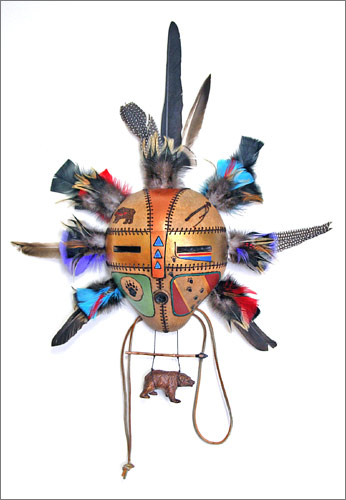 This mask has symbols of the hunt with earth toned colors.